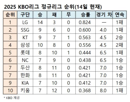 프로야구 순위표(14일 현재)