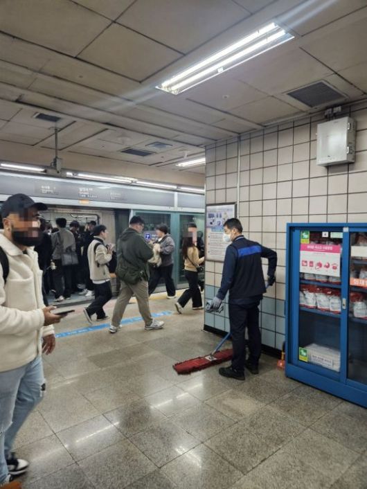 오전 8시 20분 서울 삼각지역 승강장. 의자에 앉아 있거나 핸드폰을 보며 가만히 열차를 기다리던 출근길 승객들 사이로 지하철 미화원 김모씨(53)가 분주하게 승강장 곳곳을 누비고 있었다. 한 손에는 대걸레, 다른 손에는 회색 걸레를 든 채 바닥을 닦는 그의 이마에 어느덧 구슬땀이 맺혔다. 대걸레로 승강장 바닥을 청소하고, 찌든 때가 발견되면 쭈그리고 앉아 회색 걸레로 지웠다.