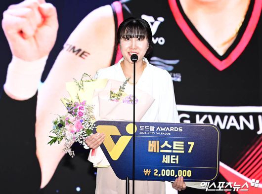 (엑스포츠뉴스 박지영 기자) 14일 오후 서울 홍은동 스위스 그랜드 호텔에서 열린 '2024~2025 도드람 V-리그 시상식'에 참석한 정관장 염혜선이 여자부 베스트7 세터 부문 수상 소감을 전하고 있다.박지영 기자 jypark@xportsnews.com