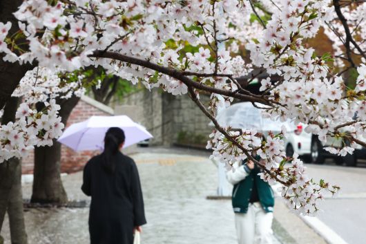 비가 내리며 쌀쌀한 날씨를 보인 14일 서울 한 대학교 캠퍼스에 벚꽃이 피어있다. 연합뉴스 |