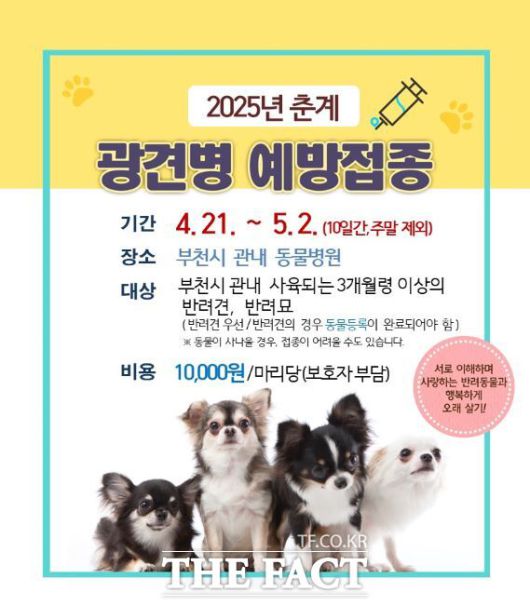 [더팩트|부천=김동선 기자] 경기 부천시는 오는 21일부터 5월 2일까지 평일에 관내 동물병원 71곳에서 춘계 광견병 예방접종을 실시한다고 14일 밝혔다.
