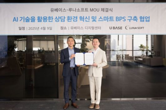 BPO(비즈니스 프로세스 아웃소싱) 전문 그룹 유베이스(대표 목진원)가 최근 AI(인공지능) 고객상담 솔루션 기업 루나소프트(대표 김범수)와 'AI 고객상담 혁신 및 스마트 BPS(비즈니스 프로세스 서비스) 구축'을 위한 전략적 MOU(업무협약)를 체결했다고 14일 밝혔다.