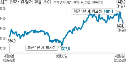 원·달러 환율은 지난 9일 글로벌 금융위기 이후 16년여 만에 최고치(1484.1원)를 기록해 1500선 돌파 우려까지 나왔다가 상호관세가 유예되면서 하락세로 급변했다.