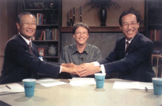 1997년 9월 초고속 정보통신 공동개발 서명 뒤 악수하는 이용태 당시 두루넷 사장(왼쪽), 빌 게이츠 마이크로소프트 회장(가운데), 이용호 한국전력 사장. 연합뉴스 |
