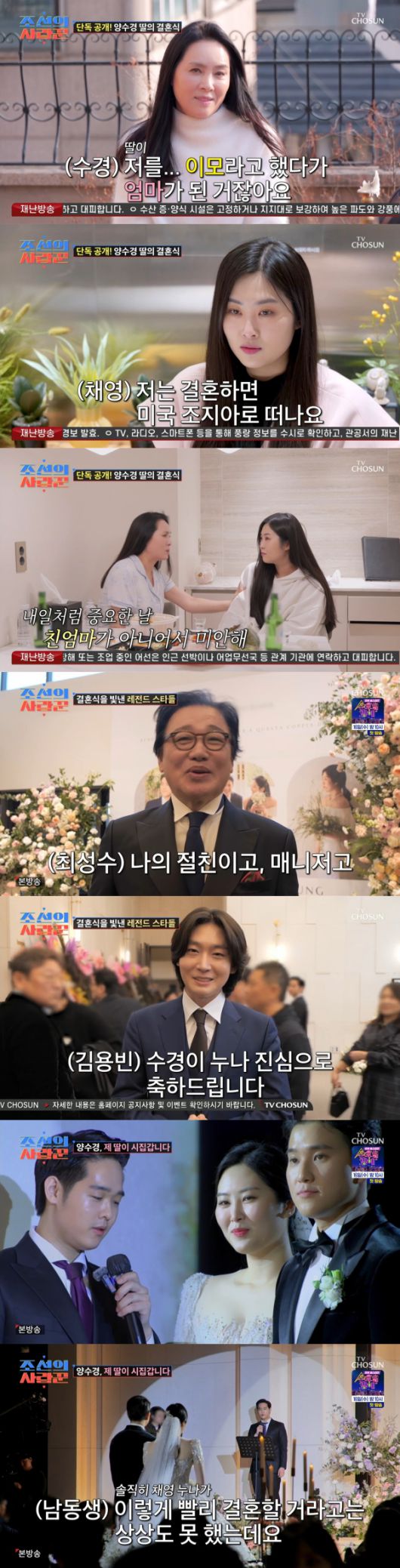 14일 방송된 TV조선 '조선의 사랑꾼'에는 가수 양수경이 가슴으로 낳아 16년간 키운 딸 윤채영의 결혼식 현장이 전파를 탔다.