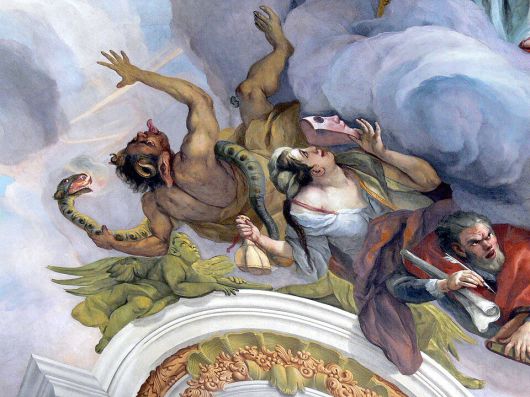 쇼펜하우어는 허영심에 대해 “직접적으로 전혀 존재하지 않는 것을 존재하는 것으로 평가하는 어리석음”이라고 평가했다. 반면 니체는 허영심을 인간의 속내를 감춰주는 ‘영혼의 피부’라며 긍정적 역할도 강조했다. 위쪽 사진은 오스트리아 화가 요한 미하엘 로트마이어가 그린 ‘신앙의 우화―신앙으로 정복된 악마와 허영심’(1714년), 아래 사진은 영국 화가 토머스 롤런드슨의 그림 ‘허영심을 바라보는 죽음’(1800년경). 사진 출처 위키미디어 |