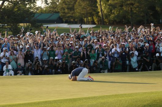 북아일랜드의 로리 매킬로이가 13일 (현지 시각) 미국 조지아주 오거스타의 오거스타 내셔널 골프 클럽에서 열린 2025 마스터스 토너먼트에서 영국의 저스틴 로즈와의 플레이오프에서 승리한 후 그린에 엎드려 오열하고 있다./EPA 연합뉴스 |
