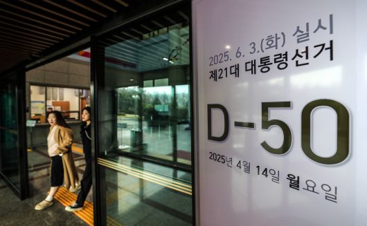 제21대 대통령 선거가 50일 남은 14일 오전 경기 과천시 중앙선거관리위원회에 대선 D-DAY 알림 문구가 띄워져 있다. /박성원 기자 |