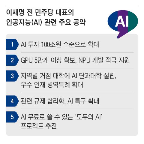 이 전 대표는 앞서 국가 주도 AI 발전 방안도 제시했다. 이 전 대표는 “유명무실했던 대통령 직속 기구 ‘국가인공지능위원회’를 내실 있게 강화하겠다”며 “기술자, 연구자, 투자 기업과 정부의 협력을 대통령이 직접 살피는 중심 기구로 재편하겠다”고 했다. 국가인공지능위원회는 작년 윤석열 정부에서 출범했는데, 이를 강화하겠다는 것이다. 그는 또 “AI 핵심 자산인 그래픽처리장치(GPU)를 최소 5만개 이상 확보하고, AI 전용 신경망처리장치(NPU) 개발을 적극 지원해 기술 주권을 확보하겠다”며 “기업의 R&D 지원을 위한 공공 데이터도 민간에 적극 개방하겠다”고 했다.
