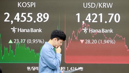 코스피 오르고 환율 급락 14일 오후 서울 중구 하나은행 본점 딜링룸에서 딜러가 업무를 보고 있다. 이날 코스피는 전 거래일보다 23.17포인트(0.95%) 오른 2,455.89에 마감됐고, 원-달러 환율은 25.8원 내린 1424.1원에 주간 거래를 마쳤다. 뉴스1 |