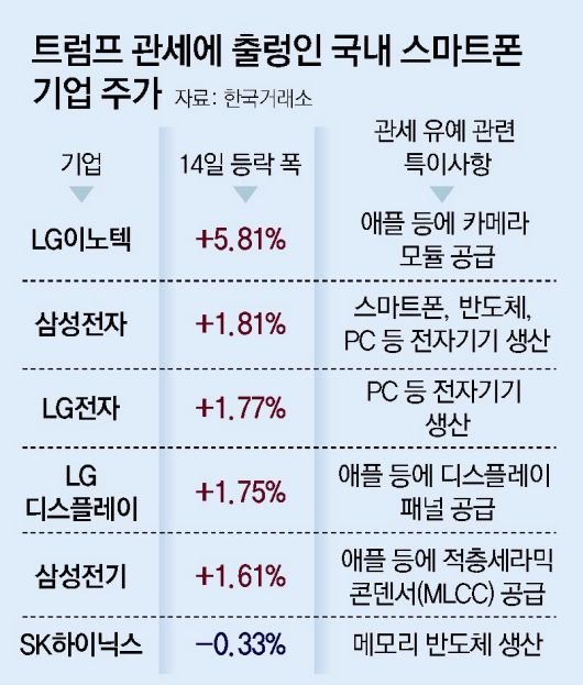 그러나 단 이틀 만인 13일 하워드 러트닉 미 상무장관이 외신 인터뷰에서 “(전자 제품을) 상호 관세에서는 면제하지만 한두 달 내 적용될 반도체 관세에 포함시킬 것”이라고 밝히자 전자 기업들의 주가 상승 폭이 줄었다. 트럼프 대통령도 “금요일에 발표된 관세에 예외는 없다”며 “(스마트폰 등은) 다른 관세로 구간(bucket)이 옮겨가는 것”이라고 강조했다.