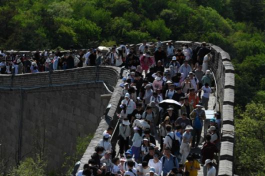 1일(현지시간) 노동절 5일 연휴 첫날 중국 베이징 북쪽의 팔달령에 있는 만리장성이 행락 인파로 북적이고 있다. 2024. 05..02 /AFPBBNews=뉴스1 |