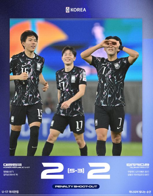 한국은 15일(한국시간) 사우디아라비아 지다 프린스 압둘라 알파이살 스타디움에서 열린 타지키스탄과의 2025 아시아축구연맹(AFC) U-17 아시안컵 8강에서 1-2로 뒤진 정규 시간 막바지 타임에 터진 김지성의 동점골로 2-2로 90분을 마쳤다. 그리고 이어지는 승부차기에서 5-3으로 앞서면서 4강행을 확정했다.