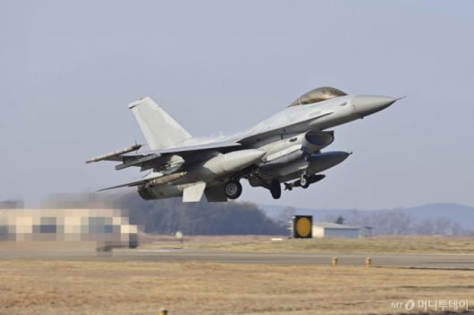공군이 지난달 6일 초유의 전투기 민가 오폭 사고를 냈다. 당시 KF-16 전투기 2대는 MK-82 폭탄을 4발씩 실사격하는 도중 좌표를 잘못 입력해 민가에 폭탄을 투하하는 사고를 냈다. 사진은 지난 1월23일 경기 포천 승진훈련장에서 열린 혹한기 공지합동 및 통합화력운용 훈련에서 MK-82 폭탄을 장착한 KF-16 전투기가 이륙하고 있다. / 사진=공군 |
