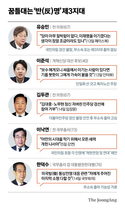 여야를 망라해 제3지대를 관통하는 키워드는 ‘반(反) 이재명’이다. “이재명을 이기겠다는 생각이 정말 조금이라도 있나”(유승민), “‘어대명(어차피 대통령 후보는 이재명)’ 경선으론 본선 승리를 장담할 수 없다”(김두관), “윤석열 정치와 이재명 정치가 함께 청산돼야 한다”(이낙연)라고들 한다.