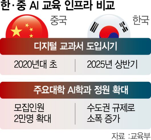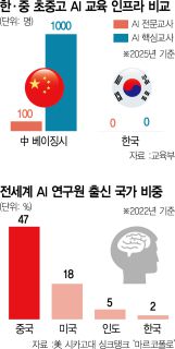 반면 한국은 AI 인재 양성 인프라가 세계 후진국 수준으로 뒤처져 있다. 교육부는 기존 초중고 교사 32만 명을 대상으로 AI 연수를 실시하겠다고 밝혔지만 정작 AI를 전문적으로 가르칠 수 있는 전문 교사는 단 한 명도 없는 것으로 나타났다. 디지털 교과서 도입도 중국이 2020년부터 시행한 데 반해 한국은 올해 상반기부터 일부 과목을 대상으로 시범 적용에 나선 수준이다.