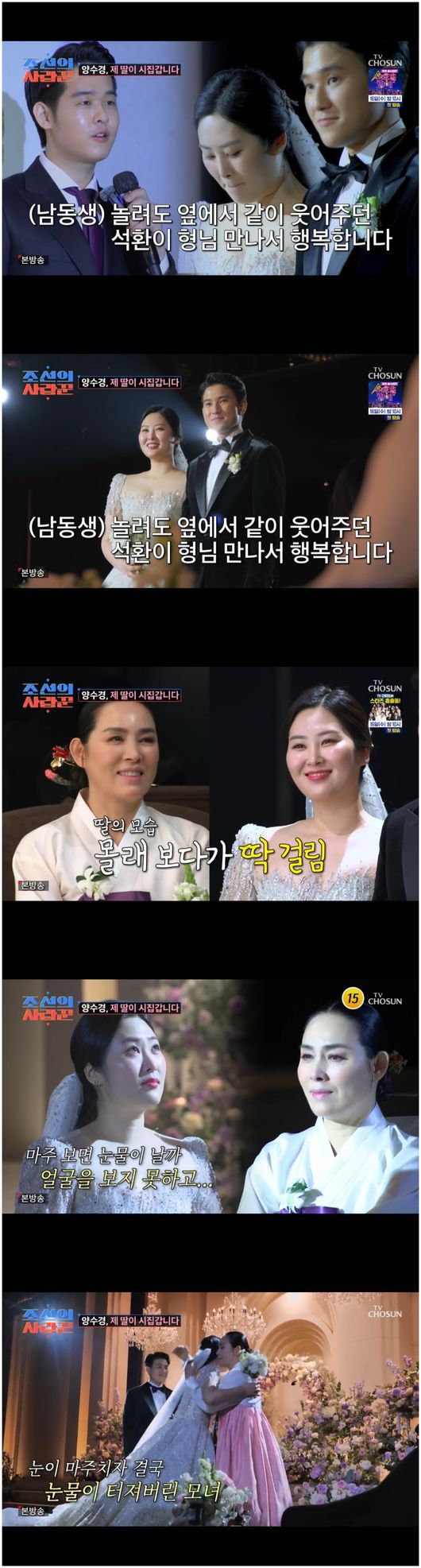 양가 부모님에게 인사를 드리는 시간이 되었다. 양수경은 끝내 딸을 안으며 눈물을 흘려 안타까움을 안겼다.