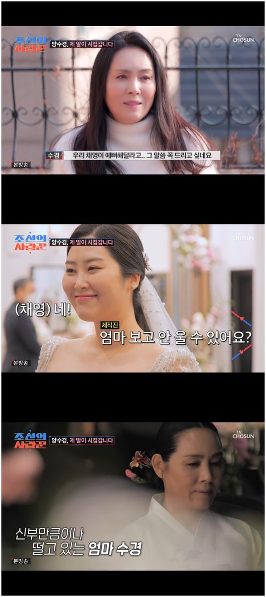 양수경은 “딸이 저랑 좀 더 같이 있을 줄 알았다. 그런데 시집 간다고 하니까 내심 섭섭했다. 나 울기 싫다. 누구보다 예쁘게 보내고 싶고, 시부모님 되실 분들께서 우리 채영이 잘 부탁드린다”라며 사돈을 향한 인사를 건넸다.