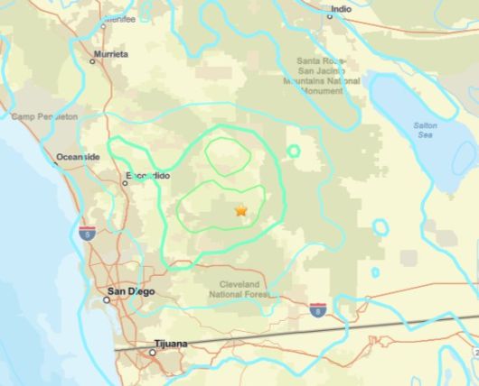 14일(현지시간) 오전10시8분쯤 미 캘리포니아 주 샌디에이고 율리안 카운티 인근에서 지진이 발생헀다. 가운데 별 표시는 진앙 지점을 가리킨다. |