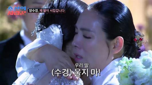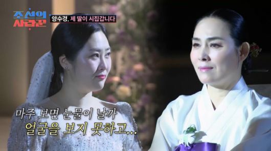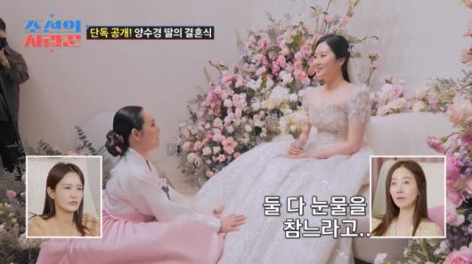 14일 방송된 TV CHOSUN '조선의 사랑꾼'에서는 '8090 레전드 가수' 양수경이 마음으로 품어 16년간 키운 딸 윤채영의 결혼식이 공개됐다. 신부 대기실에서 딸의 웨딩드레스 입은 모습을 마주한 양수경은 "울지 말자, 서로 코만 보자"며 눈물을 참았다. 하지만 시선을 마주치지 않는 노력(?)에도 눈시울이 붉어졌다. 이를 지켜본 '딸 맘' 강수지는 "(나중에) 신부 대기실에 들어가지 말아야겠다"며 과몰입해 웃음을 자아냈다.