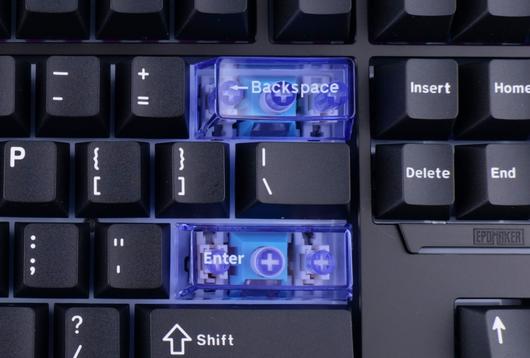 ESC키, 백스페이스키, 엔터키, 스페이스 바에는 포인트로 파란색 투명 키캡이 적용됐다. |