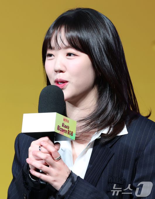 (서울=뉴스1) 권현진 기자 = 방송인 지예은이 15일 서울 종로구 JW메리어트 동대문 스퀘어 서울에서 열린 넷플릭스 새 예능 '대환장 기안장' 기자간담회에서 인사말을 하고 있다. '대환장 기안장'은 기안적 낭만이 가득한 울릉도 기안장에서 기안84와 서포트 멤버 방탄소년단 진, 배우 지예은이 숙박객들과 펼치는 기상천외한 신개념 민박 버라이어티다. 2025.4.15/뉴스1
