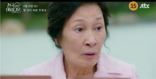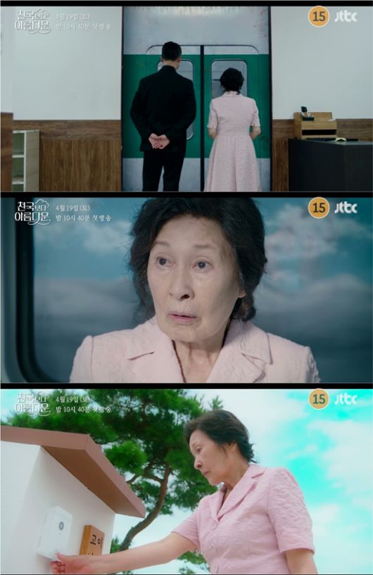 오는 19일 첫 방송되는 JTBC 새 토일드라마 '천국보다 아름다운' 측은 15일, 사랑하는 남편을 따라 저승으로 떠나게 된 이해숙(김혜자 분)의 천국행 여정이 담긴 1회 예고편을 공개했다.