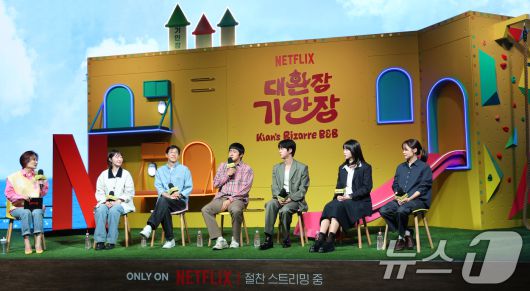 (서울=뉴스1) 권현진 기자 = 기안84(왼쪽 네번째)가 15일 서울 종로구 JW메리어트 동대문 스퀘어 서울에서 열린 넷플릭스 새 예능 '대환장 기안장' 기자간담회에서 취재진 질문에 답하고 있다. '대환장 기안장'은 기안적 낭만이 가득한 울릉도 기안장에서 기안84와 서포트 멤버 방탄소년단 진, 배우 지예은이 숙박객들과 펼치는 기상천외한 신개념 민박 버라이어티다. 2025.4.15/뉴스1