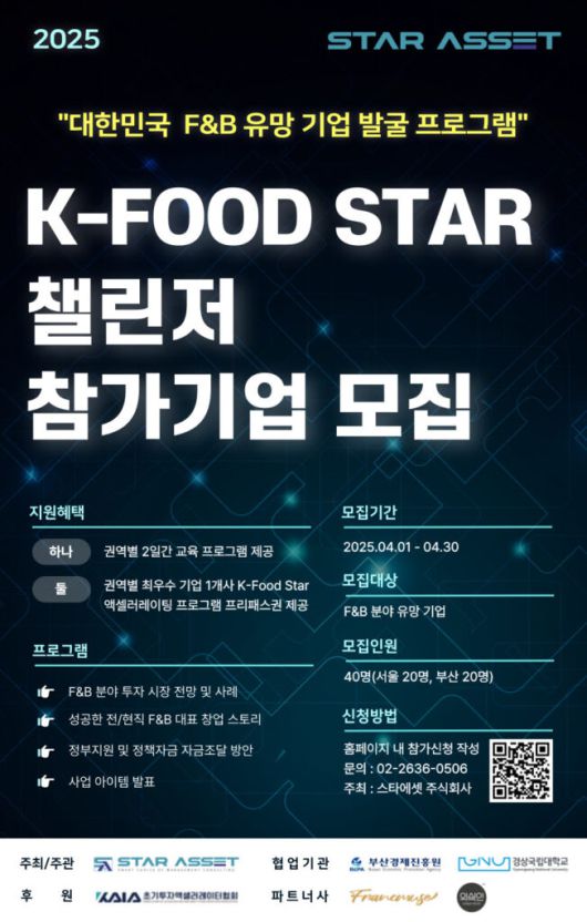 F&B 전문 경영 자문 컨설팅 기업이자 액셀러레이터인 스타에셋이 'K-Food Star 챌린저 프로그램' 참가 기업 모집을 시작한다. 이번 프로그램은 본격적인 액셀러레이팅 프로그램인 'K-Food Star'의 예비 단계로, 예비 창업자와 유망 F&B 기업들에게 실질적인 성장 발판을 제공하기 위해 기획됐다.