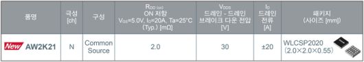 로옴 주식회사(이하 로옴)는 2.0mm×2.0mm 패키지 사이즈로 낮은 ON 저항의 Nch 30V 내압 공통 소스로 구성된 MOSFET 'AW2K21'을 개발했다고 밝혔다.