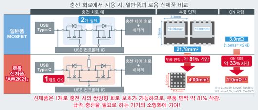 최근, 스마트폰을 비롯한 대용량 배터리를 탑재하는 소형기기에 급속 충전 기능을 채택하고 있다. 이러한 기기에는 충전하지 않는 상태에서 주변 IC 등으로 역류를 방지하기 위해 쌍방향 보호가 필요하다. 또한, 급속 충전 시 대전류로 충전을 실행하기 위한 요구 사항으로서, MOSFET에는 최대 전류 20A, 브레이크 다운 전압 28V~30V, ON 저항 5mΩ 이하라는 까다로운 조건이 요구된다. MOSFET 일반품으로 만족하기 위해서는 ON 저항이 낮은 대형 MOSFET가 2개 필요하여, 실장 면적이 커진다는 과제가 있다. 이에 로옴은 대전력 급속 충전이 가능하며 낮은 ON 저항을 가진 초소형 MOSFET 'AW2K21'을 개발했다.