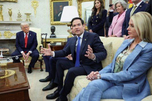 미국의 마코 루비오 국무장관(왼쪽 세번째)이 14일(현지시간) 미국 워싱턴DC 백악관에서 도널드 트럼프 미국 대통령(왼쪽 첫번째)이 지켜보는 가운데 발언하고 있다.로이터연합뉴스 |