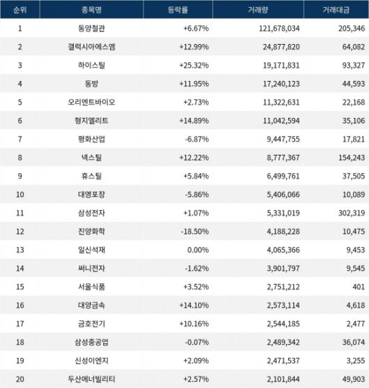 한편 거래량 상위 20위권 종목들은 삼성전자(005930) ▲1.07%, 진양화학(051630) ▼18.50%, 일신석재(007110) 0.00%, 써니전자(004770) ▼1.62%, 서울식품(004410) ▲3.52%, 대양금속(009190) ▲14.10%, 금호전기(001210) ▲10.16%, 삼성중공업(010140) ▼0.07%, 신성이엔지(011930) ▲2.09%, 두산에너빌리티(034020) ▲2.57% 등의 성적을 기록하고 있다.