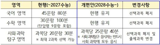 2028학년도 수능 '국어 영역'은 선택과목이 폐지되는 한편, 문항 수와 시험시간은 현행과 동일하게 45문항 80분으로 유지된다.