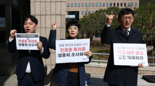 15일 경기도 과천시 정부과천청사 민원실 앞에서 열린 불법영업 전광훈 알뜰폰 방송통신위원회 신고 및 사업자등록 취소 촉구 기자회견에서 양창영 참여연대 민생희망본부장(오른쪽) 등 참석자들이 구호를 외치고 있다. |