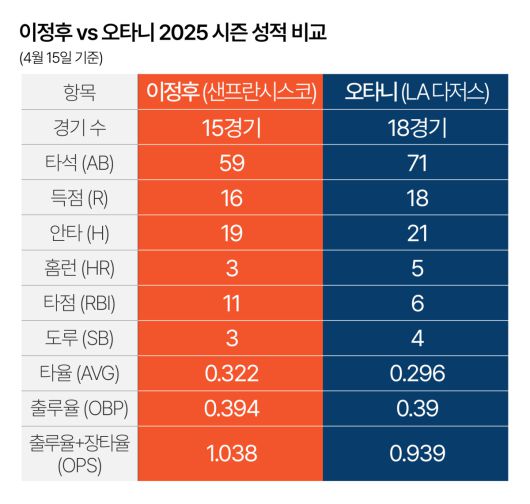 이제 사람들은 진지하게 이정후를 오타니 쇼헤이(LA 다저스)와 비교하기 시작했는데요. 오타니는 이도류(투수와 타자를 동시에 소화하는 선수)로 MLB에 진출하는 동양인들의 이정표이자 전설로 불리죠. 하지만 현재까지의 올 시즌 성적만 놓고 보면 이정후가 앞서고 있습니다.