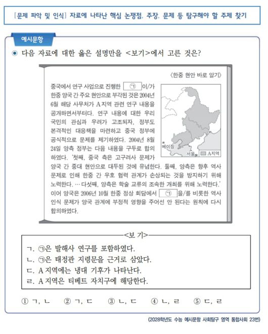 통합사회 23번 문항은 중국에서 진행한 동북공정을 묻는 문제다. 이 프로젝트가 발해사를 포함하고 있으며, 발해가 과거 위치했던 지역은 지리적으로는 냉대기후에 속한다는 점을 알아야 정답을 맞출 수 있다. 평가원은 “이런 유형의 문항을 해결하기 위해서는 동아시아의 역사 관련 현안을 다양한 자료를 통해 파악하고, 시간적·공간적 관점을 통합해 문제 해결 방안을 모색하는 학습이 필요하다”고 했다.