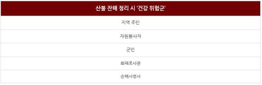 때문에 산불 진화는 물론 잔해 정리에 참여하는 △소방관 △산불재난특수진화대 △군인 △자원봉사자 △인근 주민들은 건강 이상에 대해 지속적으로 추적 관리하는 것이 필요합니다.