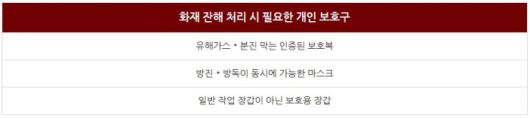 잔해 정리에 참여하는 사람 대부분이 보건용인 'KF(Korea Filter) 마스크’를 착용하지만, 이는 근본적인 해결책이 아닙니다. 미국의 경우 화재 후 집에 돌아갈 때 주민들에게 지침 가이드라인을 배포해서 교육합니다.