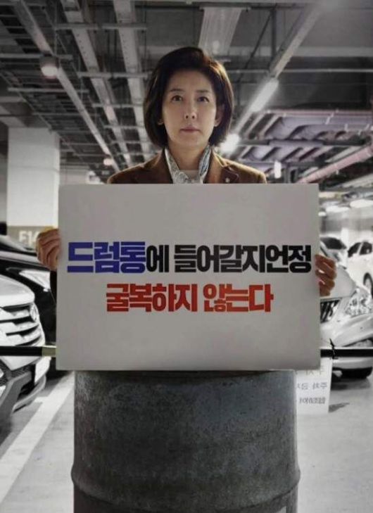 나 의원이 드럼통 안에 들어가가 "드럼통에 들어갈지언정 굴복하지 않는다"는 손팻말을 들고 있습니다.