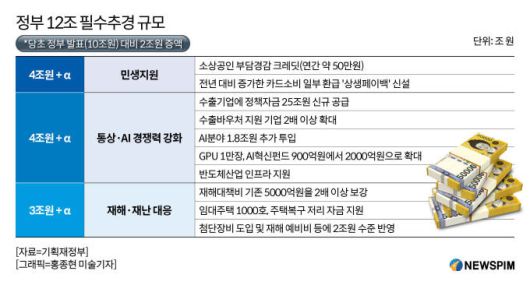 이번 추경은 ▲재해·재난 대응 ▲통상·인공지능(AI) 경쟁력 강화 ▲민생 지원이 중심이다. 재해와 재난 대응에 3조원 이상을 지원할 방침이다. 소상공인 및 취약계층에 4조원가량을, 통상 대응 및 첨단 산업 지원에 4조원 이상을 투입한다.