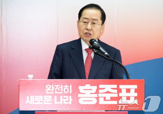 제21대 대통령선거에 출마를 선언한 홍준표 전 대구시장이 15일 오후 서울 여의도 자신의 캠프 사무실에서 '선진대국시대' 비전을 발표하고 있다. 2025.4.15/뉴스1 ⓒ News1 이재명 기자 |