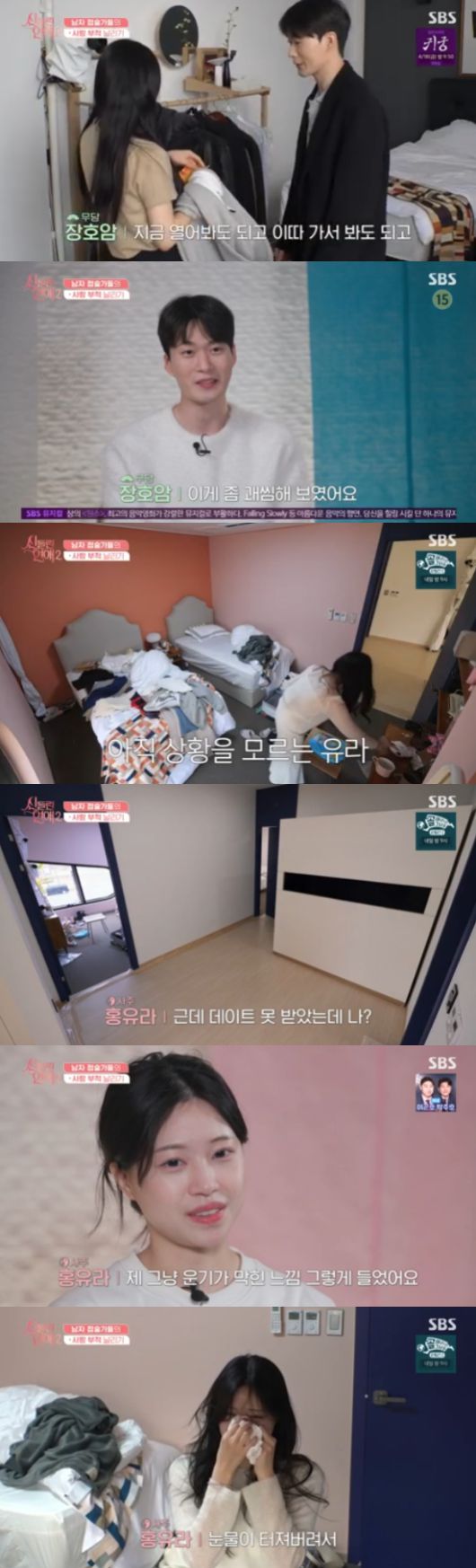 홍유라는 "저는 데이트 신청이 시작이 된 줄도 몰랐다"면서 속상한 마음에 눈물을 보였다. 홍유라는 눈물을 멈추지 못했다. 홍유라는 하루 전날 윤상혁과 데이트를 할 예정이었지만, 새 입주자 이경언이 윤상혁을 선택하면서 뜻하지 않게 데이트에서 낙오가 됐었다.
