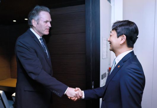 안덕근 산업통상자원부 장관(오른쪽)이 지난달 25일 서울 중구 플라자호텔에서 마이크 던리비 미국 알래스카주 주지사(왼쪽)와 면담을 하고 있다. 산업통상자원부 제공 |