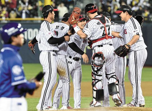 LG 선수들이 15일 삼성을 상대로 3대0, 팀 노히트 노런 승리를 거둔 뒤 기쁨을 나누고 있다. /뉴스1 |