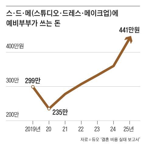 예비 신혼부부들 사이에선 ‘추가금 방어’라는 말도 유행한다. 스드메 과정에서 업체에 추가금을 내지 않는 노하우, 이른바 ‘꿀팁’을 소셜미디어에 올리는 것이다. ‘나는 추가금 방어에 실패했지만 다른 부부들은 상술에 당하지 않으면 좋겠다’며 경험담을 올리는 경우도 많다. 결혼 준비 온라인 카페에 단계별, 항목별로 스드메 지출 내용을 올린 뒤 서로 항목을 검증해 주기도 한다.