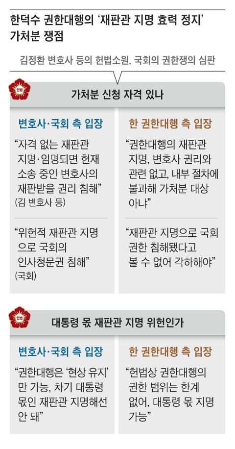 그러나 한 권한대행 측은 “재판관 지명이 변호사들이나 국회의 권한을 침해하지 않아 각하해야 한다”는 입장이다. 또 “재판관 후보자 발표는 헌법소원 대상인 ‘공권력 행사’가 아닌, 임명을 위한 내부적 절차에 불과해서 가처분 대상이 될 수 없다”고 맞서고 있다.