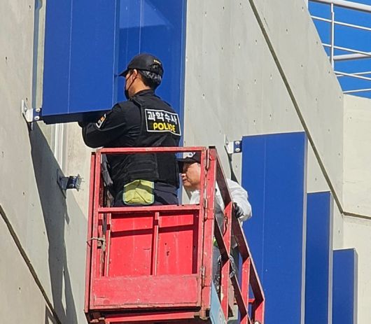 지난달 29일 구조물이 추락해 관중 1명이 사망한 경남 창원시 창원NC파크에서 8일 오후 경찰과 국립과학수사연구원 관계자들이 합동감식을 벌이고 있다. 창원=뉴스1 |
