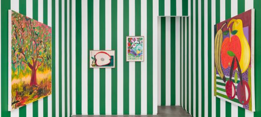 샤라 휴스와 오스틴 에디의 2인전 ‘뿌리와 과일’ 전시 전경. 전시장 벽면을 과일 시장에서 볼 수 있는 차양과 같은 무늬로 칠했다. 작가 및 에바 프레젠후버 갤러리 제공 |