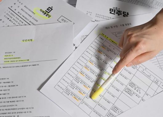 의심은 가는데 확신은 할 수 없다. 수상한 여론조사 얘기다. 민심의 바로미터라던 여론조사는 불법계엄 사태 이후 미심쩍은 결과물로 신뢰성에 심각한 상처를 입었다. 과연 여론조사는 조작이 가능한 것일까. 한국일보는 지난 두 달 여론조사 시장의 실태를 파헤치며 정치권과 조사기관의 불법 편법 공생 관계를 확인해봤다. 윤석열 대통령 탄핵으로 치러지는 21대 대통령 선거가 6월 3일로 확정된 지금, 각종 여론조사의 결과를 다시금 경계하고 조사 이면을 냉철하게 들여다볼 때다.서울 중구 한국일보 본사에서 본보 엑설런스랩 기자들이 최근 3년간 양당 회계자료를 분석하고 있다. 최주연 기자 |